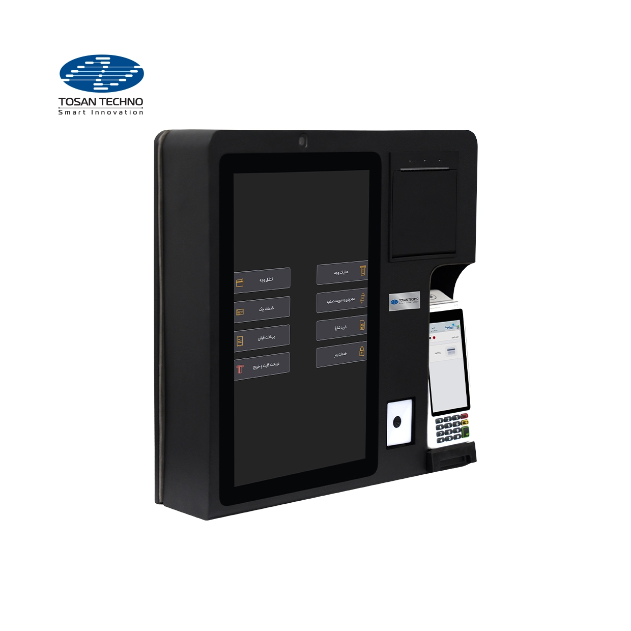 - صفحه نمایش بزرگ، بارکدخوان، دوربین تشخیص چهره و پایانه پرداخت هوشمند
